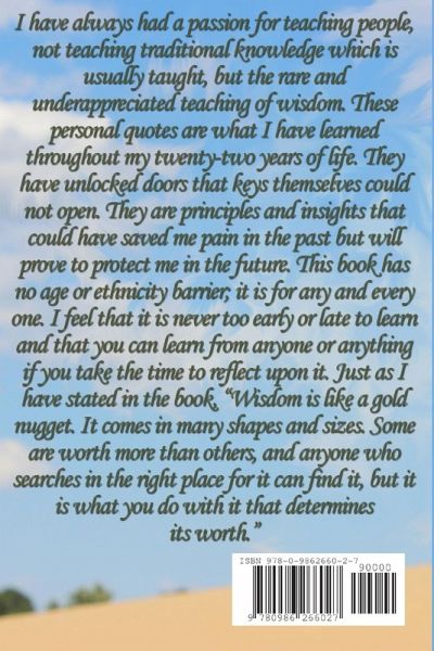 I have always had a passion for teaching people, not teaching traditional knowledge which is usually taught, but the rare and underappreciated teaching of wisdom. These personal quotes are what I have learned throughout my twenty-two years of life. They have unlocked doors that keys themselves could not open. They are principles and insights that could have saved me pain in the past but will prove to protect me in the future. This book has no age or ethnicity barrier; it is for any and every one. I feel that it is never too early or late to learn and that you can learn from anyone or anything if you take the time to reflect upon it. Just as I have stated in the book, "Wisdom is like a gold nugget. It comes in many shapes and sizes. Some are worth more than others, and anyone who searches in the right place for it can find it, but it is what you do with it that determines its worth."