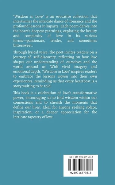 "Wisdom in Love" is an evocative collection that intertwines the intricate dance of romance and the profound lessons it imparts. Each poem delves into the heart's deepest yearnings, exploring the beauty and complexity of love in its various forms-passionate, tender, and sometimes bittersweet. Through lyrical verse, the poet invites readers on a journey of self-discovery, reflecting on how love shapes our understanding of ourselves and the world around us. With vivid imagery and emotional depth, "Wisdom in Love" inspires readers to embrace the lessons woven into their own experiences, reminding us that every heartbeat is a story waiting to be told. This book is a celebration of love's transformative power, encouraging us to find wisdom within our connections and to cherish the moments that define our lives. Ideal for anyone seeking solace, inspiration, or a deeper appreciation for the intricate tapestry of love.