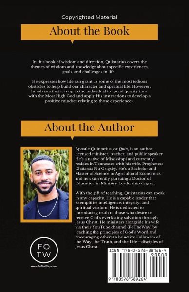 In this book of Wisdom, Insight, & Instruction, Quintarius covers the themes of wisdom and knowledge about specific experiences, goals, and challenges in life. He expresses how life can grant us some of the most tedious obstacles to help build our character and spiritual life. However, he advises that it is up to the individual to spend quality time with the Most High God and apply His instructions to develop a positive mindset relating to those experiences.