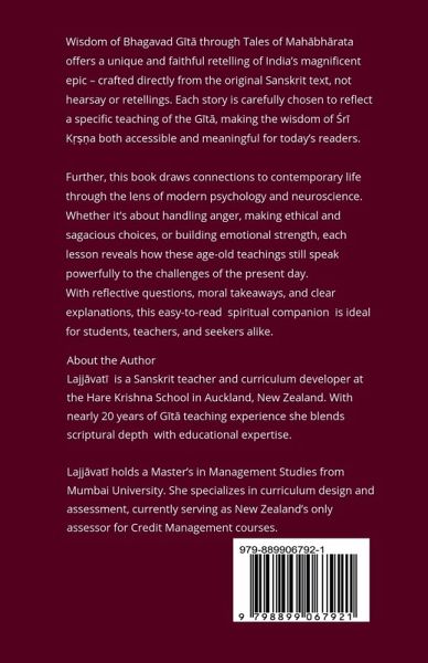 What happens when the profound truths of the Bhagavad Gītā meet the unforgettable stories of the Mahābhārata? This book offers a fresh and accessible way to explore ancient wisdom through narrative. Designed especially for students, educators, and thoughtful readers, Wisdom of Bhagavad Gītā through Tales of Mahābhārata draws powerful lessons from timeless tales, illuminating the teachings of Śrī Kṛṣṇa in a way that is both relatable and deeply relevant. Rooted in tradition, aligned with science. Each story is paired with a key Gītā verse and enriched with insights from modern psychology and neuroscience, revealing how the dilemmas faced by warriors, kings, and sages thousands of years ago mirror the challenges we face today. Whether it's dealing with doubt, building resilience, or choosing dharma over comfort, this book bridges the ancient and the modern with clarity and compassion. Perfect for the classroom - and the heart. With its engaging storytelling, reflective questions, and clear takeaways, this book is more than a study guide - it's a spiritual companion for young minds and seekers of all ages. Step into the world of epic heroes and divine wisdom, and discover the transformative power of the Bhagavad Gītā, one story at a time.