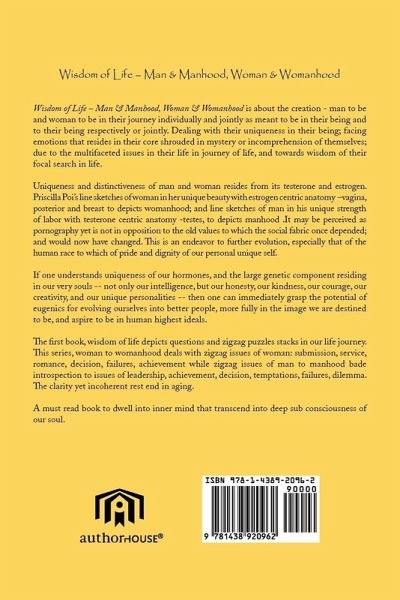 Cover design for Wisdom of Life - In Woman and Womanhood - In Man and Manhood Line sketch of woman in her beauty with oestrogen centric anatomy -vagina ,posterior and breast to depicts womanhood Line sketch of man with a farmer figurine and his anatomy depicting man and manhood as a contrarian standing and resting need in them . Terrains on top of their mind ,and sex a primordial spirituality yet consciousness of temptation Both side by side in journey of life .... Priscilla Poi