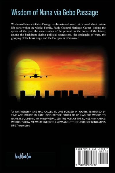 Wisdom of Nana via Gebo Passage Wisdom of Nana via Gebo Passage has been transformed into a novel about certain life parts within the whole: Family, Faith, Cultural Heritage, Career--linking the quests of the past, the uncertainties of the present, to the hopes of the future, among the backdrops during political aggression, the onslaught of wars, the grasping of the brass rings, and the Evergreens of romance. "A PARTNERSHIP, SHE HAD CALLED IT. ONE FORGED IN YOUTH, TEMPERED BY TIME AND BOUND BY FATE LONG BEFORE EITHER OF US HAD THE WORDS TO NAME IT. SUDDENLY, MY MIND VISUALIZED THE ROLL OF THE RUNES AND NANA'S WORDS: "SHOW ME WHAT I NEED TO KNOW ABOUT THE FUTURE OF BENJAMIN'S LIFE." excerpted