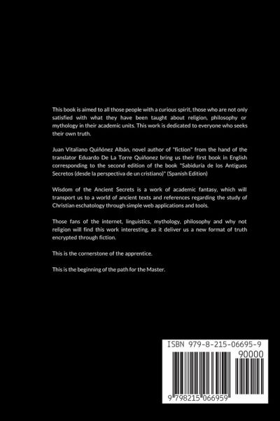 This book is aimed to all those people with a curious spirit, those who are not only satisfied with what they have been taught about religion, philosophy or mythology in their academic units. This work is dedicated to everyone who seeks their own truth. Juan Vitaliano Quiñónez Albán, novel author of "fiction" from the hand of the translator Eduardo De La Torre Quiñonez bring us their first book in English corresponding to the second edition of the book "Sabiduría de los Antiguos Secretos (desde la perspectiva de un cristiano)" (Spanish Edition) Wisdom of the Ancient Secrets is a work of academic fantasy, which will transport us to a world of ancient texts and references regarding the study of Christian eschatology through simple web applications and tools. Those fans of the internet, linguistics, mythology, philosophy and why not religion will find this work interesting, as it deliver us a new format of truth encrypted through fiction. This is the cornerstone of the apprentice. This is the beginning of the path for the Master.