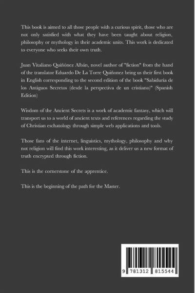 This book is aimed to all those people with a curious spirit, those who are not only satisfied with what they have been taught about religion, philosophy or mythology in their academic units. This work is dedicated to everyone who seeks their own truth. Juan Vitaliano Quiñónez Albán, novel author of "fiction" from the hand of the translator Eduardo De La Torre Quiñonez bring us their first book in English corresponding to the second edition of the book "Sabiduría de los Antiguos Secretos (desde la perspectiva de un cristiano)" (Spanish Edition) Wisdom of the Ancient Secrets is a work of academic fantasy, which will transport us to a world of ancient texts and references regarding the study of Christian eschatology through simple web applications and tools. Those fans of the internet, linguistics, mythology, philosophy and why not religion will find this work interesting, as it deliver us a new format of truth encrypted through fiction. This is the cornerstone of the apprentice. This is the beginning of the path for the Master.