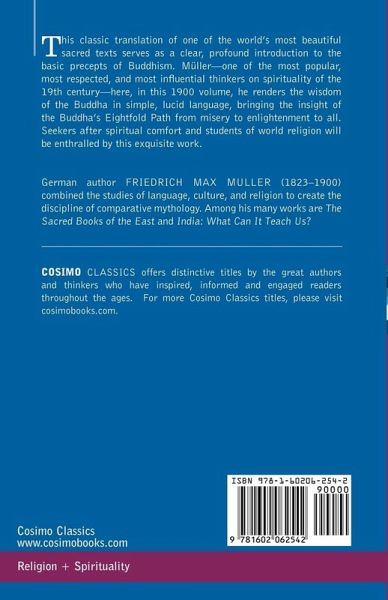 This classic translation of one of the world's most beautiful sacred texts serves as a clear, profound introduction to the basic precepts of Buddhism. Müller-one of the most popular, most respected, and most influential thinkers on spirituality of the 19th century-here, in this 1900 volume, he renders the wisdom of the Buddha in simple, lucid language, bringing the insight of the Buddha's Eightfold Path from misery to enlightenment to all. Seekers after spiritual comfort and students of world religion will be enthralled by this exquisite work. German author FRIEDRICH MAX MULLER (1823-1900) combined the studies of language, culture, and religion to create the discipline of comparative mythology. Among his many works are The Sacred Books of the East and India: What Can It Teach Us?