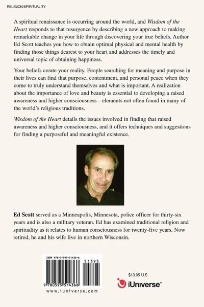 A spiritual renaissance is occurring around the world, and Wisdom of the Heart responds to that resurgence by describing a new approach to making remarkable change in your life through discovering your true beliefs. Author Ed Scott teaches you how to obtain optimal physical and mental health by finding those things dearest to your heart and addresses the timely and universal topic of obtaining happiness. Your beliefs create your reality. People searching for meaning and purpose in their lives can find that purpose, contentment, and personal peace when they come to truly understand themselves and what is important. A realization about the importance of love and beauty is essential to developing a raised awareness and higher consciousness-elements not often found in many of the world's religious traditions. Wisdom of the Heart details the issues involved in finding that raised awareness and higher consciousness, and it offers techniques and suggestions for finding a purposeful and meaningful existence.