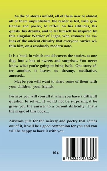 In a world that glorifies the appearance and the frenzy of consumption, many feel helpless when they find themselves being crossed by the eternal existential questions: Who am I? Where am I going? What is the meaning of my life? How do I behave in front of others, in front of difficulties? What am I doing on this earth? ... And these questions, everyone asks themselves, sooner or later. It is at this point that this little book takes on its full dimension. As the 64 stories unfold, all or almost all unpublished, the reader is led, without appearing to be, without moralizing diktat, but not without poetry, to reflect on his attitudes, his quests, to be inspired by this singular Warrior of Light, who restores the values of the ancient chivalry that everyone carries within him, on a resolutely modern note. It is a book in which one discovers the stories, as one digs into a box of sweets and surprises. You never know what you're going to bring back. One story after another, it leavesus dreamy, meditative, amused... Maybe you will want to share some of them with your children, your friends, maybe you will consult it when you have a difficult question to solve... It would not be surprising if you find the answer to a current difficulty... That's the magic of this book... Anyway, just for the naivety and the poetry that emerges from it, it will be a good companion for you and you will be happy to have it with you.