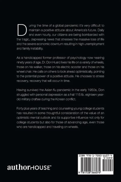 During the time of a global pandemic it's very difficult to maintain a positive attitude about America's future. Daily and even hourly, our citizens are being bombarded with the tragic, depressing news that stresses the massive loss of life and the severe economic downturn resulting in high unemployment and family instability. As a handicapped former professor of psychology now nearing ninety years of age, Dr. Don Huard lives his life on a variety of wheels, those on his walker, those on his electric scooter and those on his wheel chair. He calls on others to look ahead optimistically, pointing to the potential power of a positive attitude. He chooses to stress recovery, recovery that will occur in time. Having survived the Asian flu pandemic in the early 1950s, Don struggled with personal depression as a frail 115 lb. eighteen year-old military draftee during the Korean conflict. Forty plus years of teaching and counseling young college students has resulted in some thoughtful consideration of the value of an optimistic mental outlook and its supportive influence not only for college students but also for those of advancing age, even those who are handicapped and traveling on wheels.