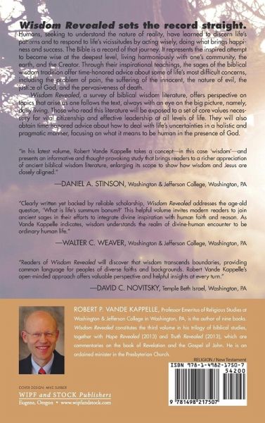 Humans, seeking to understand the nature of reality, have learned to discern life's patterns and to respond to life's vicissitudes by acting wisely, doing what brings happiness and success. The Bible is a record of that journey. It represents the inspired attempt to become wise at the deepest level, living harmoniously with one's community, the earth, and the Creator. Through their inspirational teachings, the sages of the biblical wisdom tradition offer time-honored advice about some of life's most difficult concerns, including the problem of pain, the suffering of the innocent, the nature of evil, the justice of God, and the pervasiveness of death. Wisdom Revealed, a survey of biblical wisdom literature, offers perspective on topics that arise as one follows the text, always with an eye on the big picture, namely, daily living. Those who read this literature will be exposed to a set of core values necessary for vital citizenship and effective leadership at all levels of life. They will also obtain time-honored advice about how to deal with life's uncertainties in a holistic and pragmatic manner, focusing on what it means to be human in the presence of God.