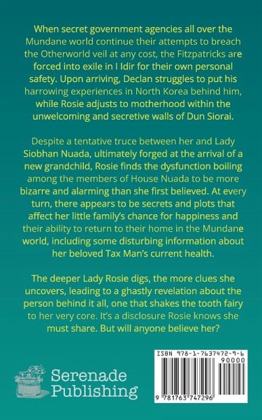 When secret government agencies all over the Mundane world continue their attempts to breach the Otherworld veil at any cost, the Fitzpatricks are forced into exile in I Idir for their own personal safety. Upon arriving, Declan struggles to put his harrowing experiences in North Korea behind him, while Rosie adjusts to motherhood within the unwelcoming and secretive walls of Dun Siorai. Despite a tentative truce between her and Lady Siobhan Nuada, ultimately forged at the arrival of a new grandchild, Rosie finds the dysfunction boiling among the members of House Nuada to be more bizarre and alarming than she first believed. At every turn, there appears to be secrets and plots that affect her little family's chance for happiness and their ability to return to their home in the Mundane world, including some disturbing information about her beloved Tax Man's current health. The deeper Lady Rosie digs, the more clues she uncovers, leading to a ghastly revelation about the person behind it all, one that shakes the tooth fairy to her very core. It's a disclosure Rosie knows she must share. But will anyone believe her?