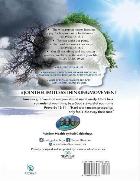 Success is not by chance! Living an incredible life is not by fate! Do you want to live a successful and phenomenal life? A remarkable life of significance starts by knowing exactly what it is that God expects from you! Your personal reflective observations from the sayings in the book of Proverbs directed by the authors' thinking in Wisdom Wealth will enable you to impact and influence the world with worth noticing and meaningful life-enriching realities. Information brings knowledge; knowledge leads to power and the knowledge you share is empowering your eco-system! Wisdom Wealth will provide you with opportunities to reflect on the meaning of your life and will challenge you to live a life as expected by God that will result in you fulfilling the reason why God has created you. It is important to reflect with an honest and right mind set. Wisdom Wealth can be seen as a DECODING process of what and how God expects you to live your life! Do you realise that you have greatness within you? You have unlimited potential and value. You were born to succeed as God the Creator has designed YOU HIMSELF. There was none before you… and there will be none after you… that will bring your special gift, your uniqueness into this world! YOU MUST stop to try and live someone else's life! This copy-cat action-mentality will only imprison and limit the progression of your own unique special gift giving to you by God. Embrace the reality that you were created by God to be different. Be Unique. Be Special. Be meaning in this world! Meaning comes from belonging and serving something beyond yourself. Don't settle for less than what you can be. Develop yourself to the best you can be. Break free of limiting believes and thinking that holds you back. Do not live a life as expected and advocated by the world and people. Live a life only guided by the principles and expectations of how and what God wants you to live. Start today! Re-invent yourself! Re-purpose YOUR ETERNAL FUTURE! It is not how much you have or what special gift God has given you that matters but it is what you do with what you have that will determine how successful and remarkable you live in the eyes of God and the expectations He has for your life. You should think about the commands and expectations in the Word of God as being so powerful that it will be the main reason WHY YOU will succeed or fail in the purpose why God has created you for. The way you speak and live your life, the attitude and tone (do you want to please people or do you want to do what God expects you to do) will reflect the person you are and what is important to you. YOUR LIFE IS ALL ABOUT CHOICES! YOU CAN CHOOSE TO PLEASE PEOPLE OR TO DO WHAT GOD EXPECTS YOU TO DO! THE CHOICES YOU MAKE EACH AND EVERY DAY WILL RESHAPE AND REDEFINE YOUR FUTURE!!! CONNECT WITH GREATNESS TODAY… GOING FORWARD ALWAYS START WITH A THINKING-FOUNDATION THAT YOU MUST LIVE YOUR LIFE AS EXPECTED BY GOD!