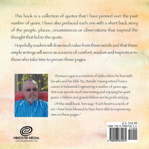 This book is a collection of quotes that I have penned over the past number of years. I have also prefaced each one with a short back story of the people, places, circumstances or observations that inspired the thought that led to the quote. Hopefully readers will draw much value from these words and that these simple writings will serve as a source of comfort, wisdom and inspiration to those who take time to peruse these pages.