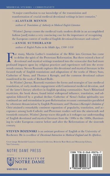 Steven Rozenski reopens old discussions and addresses new ones concerning late medieval devotional texts, particularly those showing continental and German influences. For many, Martin Luther's translation of the Bible into German has come to define the spirit of the Protestant Reformation. But there existed a host of devotional and mystical writings translated into the vernacular that had more profound impacts upon lay religious practices and experiences well into the seventeenth century. Steven Rozenski explores this devotional and mystical literature in his focused study of English translations and adaptations of the works of Henry Suso, Catherine of Siena, and Thomas à Kempis, and the common devotional culture manifested in the work of Richard Rolle. In Wisdom's Journey, Rozenski examines the forms and strategies of late medieval translation, of early modern engagement with Continental medieval devotion, and of the latter's literary afterlives in English-speaking communities. Suso's Rhineland mysticism, the book shows, found initial widespread influence, translation, and adaptation followed by a gradual decline; Catherine of Siena's Italian spirituality saw continued use and retranslation in post-Reformation recusant communities paralleled by vehement denunciation by English Protestants; and Thomas à Kempis's Imitation of Christ attained a remarkably consistent expansion of popularity, translation, and acceptance among both Catholic and Protestant readers well into the nineteenth and twentieth centuries. Wisdom's Journey traces this path as it reshapes our understanding of English devotional and mystical literature from the 1400s to the 1600s, illuminating its wider European context before and after the Reformations of the sixteenth century. Written primarily for scholars in medieval mysticism, Reformation studies, and translation studies, the book will also appeal to readers interested in medieval studies and English literature more broadly.