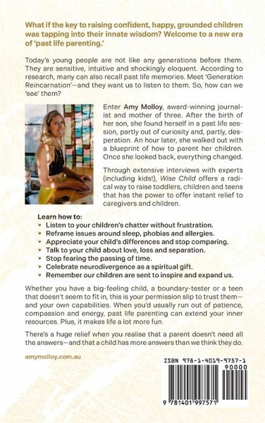 Today's young people are not like any generations before them. They are sensitive, intuitive and shockingly eloquent. According to research, many can also recall past life memories. Meet 'Generation Reincarnation'-and they want us to listen to them. So, how can we 'see' them? Enter Amy Molloy, award-winning journalist and mother of three. After the birth of her son, she found herself in a past life session, partly out of curiosity and, partly, desperation. An hour later, she walked out with a blueprint of how to parent her children. Once she looked back, everything changed. Through extensive interviews with experts (including kids!), Wise Child offers a radical way to raise toddlers, children and teens that has the power to offer instant relief to caregivers and children. Learn how to- Listen to your children's chatter without frustration. Reframe issues around sleep, phobias and allergies. Appreciate your child's differences and stop comparing. Talk to your child about love, loss and separation. Stop fearing the passing of time. Celebrate neurodivergence as a spiritual gift. Remember our children are sent to inspire and expand us. Whether you have a big-feeling child, a boundary-tester or a teen that doesn't seem to fit in, this is your permission slip to trust them-and your own capabilities. When you'd usually run out of patience, compassion and energy, past life parenting can extend your inner resources. Plus, it makes life a lot more fun. There's a huge relief when you realise that a parent doesn't need all the answers-and that a child has more answers than we think they do.
