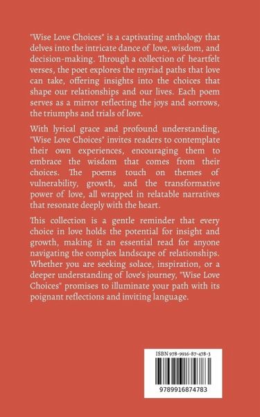"Wise Love Choices" is a captivating anthology that delves into the intricate dance of love, wisdom, and decision-making. Through a collection of heartfelt verses, the poet explores the myriad paths that love can take, offering insights into the choices that shape our relationships and our lives. Each poem serves as a mirror reflecting the joys and sorrows, the triumphs and trials of love. With lyrical grace and profound understanding, "Wise Love Choices" invites readers to contemplate their own experiences, encouraging them to embrace the wisdom that comes from their choices. The poems touch on themes of vulnerability, growth, and the transformative power of love, all wrapped in relatable narratives that resonate deeply with the heart. This collection is a gentle reminder that every choice in love holds the potential for insight and growth, making it an essential read for anyone navigating the complex landscape of relationships. Whether you are seeking solace, inspiration, or a deeper understanding of love's journey, "Wise Love Choices" promises to illuminate your path with its poignant reflections and inviting language.