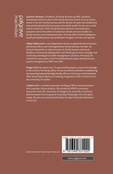 JOACHIM SCHWASS is Professor of Family Business at IMD, Lausanne, Switzerland where he directs the Family Business Center. He is an active owner in his own family business and for almost 20 years has studied and educated leading family businesses around the world. He also sits on the board of directors of the Family Business Network International in Lausanne and is the author of numerous articles and case studies on family business and entrepreneurship. His book Wise Growth Strategies in Leading Family Businesses was published in English, German and Spanish. HÅKAN HILLERSTRÖM is an independent advisor to global family businesses and family offices, and a third generation family business member. He lectures frequently on relevant topics in family business and serves families in business by helping them craft family governance, strategic and continuity planning and wealth management solutions. Previously he worked for seven years in the PriceWaterhouseCoopers family business practice and gained an MBA from IMD. HOLGER KÜCK has spent over 12 years building expert, practical knowledge in the world of the family office. He has served three families in establishing and operating substantial single-family offices, in Germany and Switzerland. After obtaining his diploma in banking, he gained an MSc in finance from the University of London. COLLEEN LIEF is a research associate working at IMD on family business and corporate culture projects. She earnedan MPhil in monetary economics from the University of Glasgow, UK and a BSc in business administration from Duquesne University, Pittsburgh, USA. She spent nearly 20 years as a commercial banker at major financial institutions in the USA.