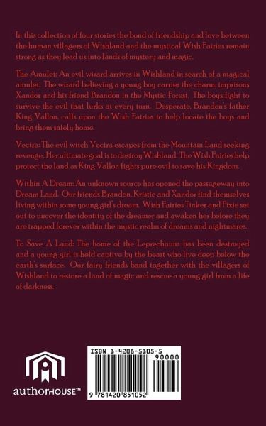 In this collection of four stories the bond of friendship and love between the human villagers of Wishland and the mystical Wish Fairies remain strong as they lead us into lands of mystery and magic. The Amulet: An evil wizard arrives in Wishland in search of a magical amulet. The wizard believing a young boy carries the charm, imprisons Xandor and his friend Brandon in the Mystic Forest. The boys fight to survive the evil that lurks at every turn. Desperate, Brandon's father King Vallon, calls upon the Wish Fairies to help locate the boys and bring them safely home. Vectra: The evil witch Vectra escapes from the Mountain Land seeking revenge. Her ultimate goal is to destroy Wishland. The Wish Fairies help protect the land as King Vallon fights pure evil to save his Kingdom. Within A Dream: An unknown source has opened the passageway into Dream Land. Our friends Brandon, Kristie and Xandor find themselves living within some young girl's dream. Wish Fairies Tinker and Pixie set out to uncover the identity of the dreamer and awaken her before they are trapped forever within the mystic realm of dreams and nightmares. To Save A Land: The home of the Leprechauns has been destroyed and a young girl is held captive by the beast who live deep below the earth's surface. Our fairy friends band together with the villagers of Wishland to restore a land of magic and rescue a young girl from a life of darkness.