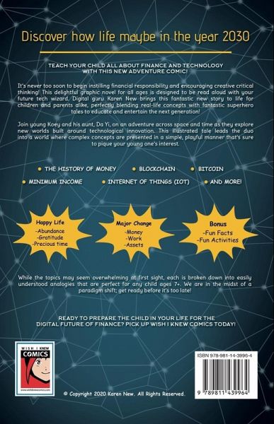 Comics book that gives you a glimpse of our future with Blockchain, Bitcoin and IoT... Karen New Introduce your child all about finance and technology in this brand new adventure comic! It's never too soon to instil finance responsibility and encourage creative critical thinking! This delightful all-ages graphic novel designed to be read aloud with your future tech wizard. Da Yi brings to life this fantastic new story for children and parents alike, blending real-life concepts with fantastic superhero tales perfectly to educate and entertain the next generation! Join young Koey and his aunt (DaYi) on an adventure across space and time as they explore brand new worlds built around technological innovation. This graphic novel leads this duo into a world where complex concepts are presented in a simple, playful manner that's sure to pique a young one's interest. Content: The history of money Blockchain Bitcoin Smart contracts DAO (Decentralised Autonomous Organisation) While the topics may seem overwhelming at first place, each is broken down into easily understood analogies perfect for any child 7+. We are in the midst of transiting to a paradigm shift, get ready before it's too late! Ready to prepare the child in your life for the digital future of finance? ---------------------------------------------------- Why did you create Wish I Knew? Personally, I learn about database which is a really hard topic for me via a comic book. So I thought "why not I do the same for people to learn about Blockchain, Bitcoin ..which seem too technical and complex. Instead of talking about the technology, this comic book talks about the implication of how our life will be like with these technologies. Similar to the Internet revolution, we do not have to know how TCPIP works, we are just happy using the internet. On top of that, artificial intelligence has advanced so much that academia results will no longer be that important. With decentralization, the way we work will transform, by getting ourselves into the new order now, we will integrate ourselves for the paradigm shift. The revolution has already started. I implore all to experience this technology by taking action. It is easy to take baby steps. Comics simple enough for kids to understand. By reading to their kids, I hope to evoke the parents' curiosity to learn more about the Blockchain ecosystem. You can take baby steps to learn together with your children by getting the workbook edition sold separately. By taking part in some activities, I hope both parents and children will learn more about the blockchain revolution. Knowledge is power! Take action and get ready.