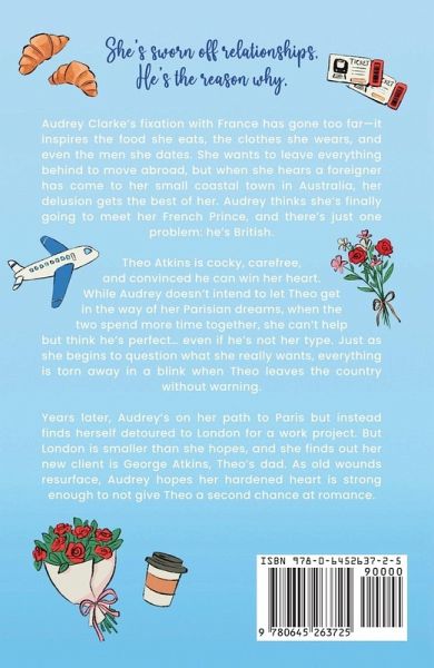 Audrey Clarke's fixation with France has gone too far-it inspires the food she eats, the clothes she wears, and even the men she dates. She wants to leave everything behind to move abroad, but when she hears a foreigner has come to her small coastal town in Australia, her delusion gets the best of her. Audrey thinks she's finally going to meet her French Prince, and there's just one problem: he's British. Theo Atkins is cocky, carefree, and convinced he can win her heart. While Audrey doesn't intend to let Theo get in the way of her Parisian dreams, when the two spend more time together, she can't help but think he's perfect... even if he's not her type. Just as she begins to question what she really wants, everything is torn away in a blink when Theo leaves the country without warning. Years later, Audrey's on her path to Paris but instead finds herself detoured to London for a work project. But London is smaller than she hopes, and she finds out her new client is George Atkins, Theo's dad. As old wounds resurface, Audrey hopes her hardened heart is strong enough to not give Theo a second chance at romance.