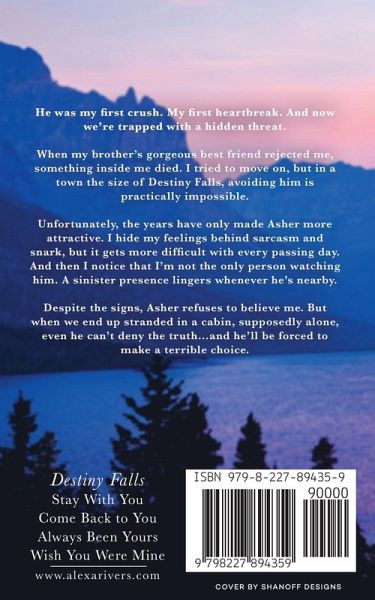 He was my first crush. My first heartbreak. And now we're trapped with a hidden threat. When my brother's gorgeous best friend rejected me, something inside me died. I tried to move on, but in a town the size of Destiny Falls, avoiding him is practically impossible. Unfortunately, the years have only made Asher more attractive. I hide my feelings behind sarcasm and snark, but it gets more difficult with every passing day. And then I notice that I'm not the only person watching him. A sinister presence lingers whenever he's nearby. Despite the signs, Asher refuses to believe me. But when we end up stranded in a cabin, supposedly alone, even he can't deny the truth...and he'll be forced to make a terrible choice.