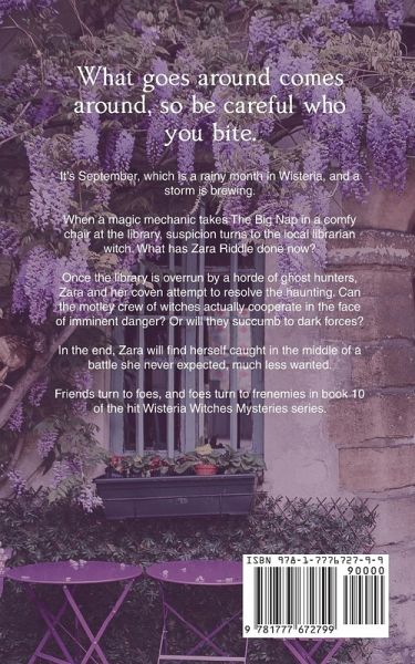 What goes around comes around, so be careful who you bite. It's September, which is a rainy month in Wisteria, and a storm is brewing. When a magic mechanic takes The Big Nap in a comfy chair at the library, suspicion turns to the local librarian witch. What has Zara Riddle done now? Poisoned the guy for talking too loud? She shrugs off the accusations, as usual, and tries to help with the investigation, also as usual. But this time around, the local vampire detective isn't swinging by Zara's house to take her along for the ride. He may be Zara's boyfriend after hours, but when it comes to solving crimes, he has a new partner. For Zara, dealing with "that girl" is like getting turned into a cat, then being petted backward, from tail to nose. It's just wrong! Worst of all, the town's new ghost is becoming an international celebrity, attracting outsiders and media attention. Once the library is overrun by a horde of ghost hunters, Zara and her coven attempt to resolve the haunting. Can the motley crew of witches actually cooperate in the face of imminent danger? Or will they succumb to dark forces? In the end, Zara will find herself caught in the middle of a battle she never expected, much less wanted. Friends turn to foes, and foes turn to frenemies in book 10 of the hit Wisteria Witches Mysteries series, WISHFUL WISTERIA.