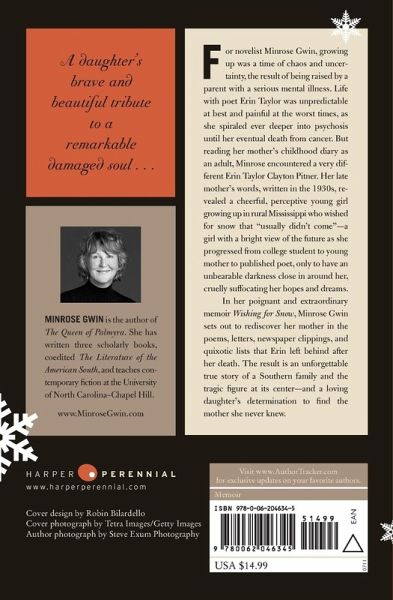 A daughter's brave and beautiful tribute to a remarkable damaged soul . . . For novelist Minrose Gwin, growing up was a time of chaos and uncertainty, the result of? being raised by a parent with a serious mental illness. Life with poet Erin Taylor was unpredictable at best and painful at the worst times, as she spiraled ever deeper into psychosis until her eventual death from cancer. But reading her mother's childhood diary as an adult, Minrose encountered a very different Erin Taylor Clayton Pitner. Her late mother's words, written in the 1930s, revealed a cheerful, perceptive young girl growing up in rural Mississippi who wished for snow that "usually didn't come"?a girl with a bright view of the future as she progressed from college student to young mother to published poet, only to have an unbearable darkness close in around her, cruelly suffocating her hopes and dreams. In her poignant and extraordinary memoir Wishing for Snow, Minrose Gwin sets out to rediscover her mother in the poems, letters, newspaper clippings, and quixotic lists that Erin left behind after her death. The result is an unforgettable true story of a Southern family and the tragic figure at its center?and a loving daughter's determination to find the mother she never knew.