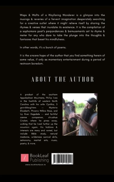 ""Wisps & Wafts of a Wayfaring Wanderer is a glimpse into the musings & reveries of a fervent imagination desperately searching for a creative outlet where it might relieve itself by sharing the rhymes & verses that inundate its existence. It is the compilation of a sophomore poet's perpondences & bemusements set to rhyme & meter for any who dare to take the plunge into the thoughts & fantasies that beset his mindfulness. In other words, it's a bunch of poems. It is the sincere hope of the author that you find something herein of some value, if only as momentary entertainment during a period of restroom boredom.""