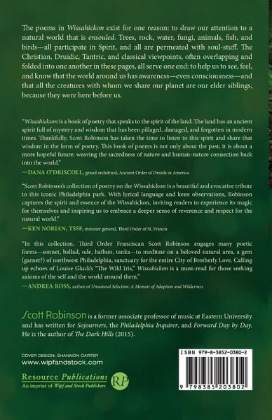 The poems in Wissahickon exist for one reason: to draw our attention to a natural world that is ensouled. Trees, rock, water, fungi, animals, fish, and birds--all participate in Spirit, and all are permeated with soul-stuff. The Christian, Druidic, Tantric, and classical viewpoints, often overlapping and folded into one another in these pages, all serve one end: to help us to see, feel, and know that the world around us has awareness--even consciousness--and that all the creatures with whom we share our planet are our elder siblings, because they were here before us.