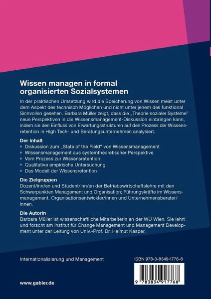 In der praktischen Umsetzung wird die Speicherung von Wissen meist unter dem Aspekt des technisch Möglichen und nicht unter jenem des funktional Sinnvollen gesehen. Barbara Müller zeigt, dass die "Theorie sozialer Systeme" neue Perspektiven in die Wissensmanagement-Diskussion einbringen kann, indem sie den Einfluss von Erwartungsstrukturen auf den Prozess der Wissensretention in High Tech- und Beratungsunternehmen analysiert.