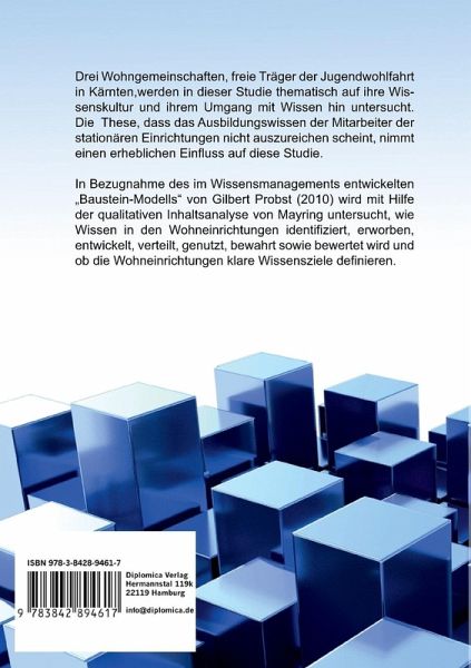 Drei Wohngemeinschaften freier Träger der Jugendwohlfahrt in Kärnten werden in dieser Studie thematisch auf ihren Umgang mit Wissen untersucht. Die Wissenskultur der Wohngemeinschaften steht damit im Vordergrund dieser Untersuchung. Dabei nimmt die zuvor herausgearbeitete These, die behauptet, dass das Ausbildungswissen der Mitarbeiter der stationären Einrichtungen der Jugendwohlfahrt nicht auszureichen scheint, einen erheblichen Einfluss auf diese Studie. In Bezug auf das im Wissensmanagement entwickelte Baustein-Modell von Gilbert Probst (2010), wird mit Hilfe der qualitativen Inhaltsanalyse von Mayring untersucht, wie Wissen in den Wohneinrichtungen identifiziert, erworben, entwickelt, verteilt, genutzt, bewahrt und bewertet wird und ob die Wohneinrichtungen klare Wissensziele definieren.