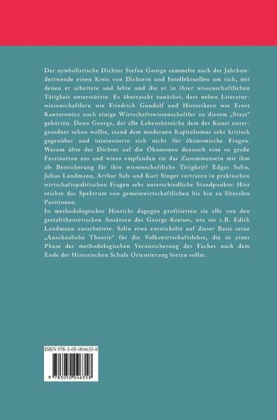 Der symbolistische Dichter Stefan George sammelte nach der Jahrhundertwende einen Kreis von Dichtern und Intellektuellen um sich, mit denen er arbeitete und lebte, und die er in ihrer wissenschaftlichen Tätigkeit unterstützte. Es überrascht zunächst, dass neben Literaturwissenschaftlern wie Friedrich Gundolf und Historikern wie Ernst Kantorowicz auch einige Wirtschaftswissenschaftler zu diesem "Staat" gehörten. Denn George, der alle Lebensbereiche dem der Kunst untergeordnet sehen wollte, stand dem modernen Kapitalismus sehr kritisch gegenüber und interessierte sich nicht für ökonomische Fragen. Warum übte der Dichter auf die Ökonomen dennoch eine so große Faszination aus, und wieso empfanden sie das Zusammensein mit ihm als Bereicherung für ihre wissenschaftliche Tätigkeit? Edgar Salin, Julius Landmann, Arthur Salz und Kurt Singer vertraten in praktischen wirtschaftspolitischen Fragen sehr unterschiedliche Standpunkte: hier reichte das Spektrum von gemeinwirtschaftlichen bis hin zu liberalen Positionen. In methodologischer Hinsicht dagegen profitierten sie alle von den gestalttheoretischen Ansätzen des George-Kreises, wie sie z.B. Edith Landmann ausarbeitete. Salin etwa entwickelte auf dieser Basis seine "Anschauliche Theorie" für die Volkswirtschaftslehre, die in einer Phase der methodologischen Verunsicherung des Faches nach dem Ende der Historischen Schule Orientierung bieten sollte.