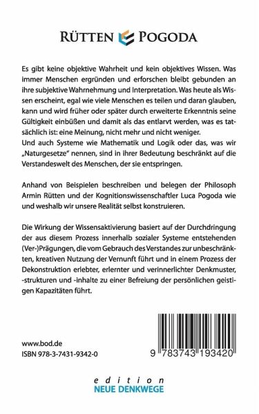 Es gibt keine objektive Wahrheit und kein objektives Wissen. Was immer Menschen ergründen und erforschen bleibt gebunden an ihre subjektive Wahrnehmung und Interpretation. Was heute als Wissen erscheint, egal wie viele Menschen es teilen und daran glauben, kann und wird früher oder später durch erweiterte Erkenntnis seine Gültigkeit einbüßen und damit als das entlarvt werden, was es tatsächlich ist: eine Meinung, nicht mehr.Und auch Systeme wie Mathematik und Logik oder das, was wir "Naturgesetze" nennen, sind in ihrer Bedeutung beschränkt auf die Verstandeswelt des Menschen, der sie entspringen.Anhand von Beispielen beschreiben der Philosoph Armin Rütten und der Kognitionswissenschaftler Luca Pogoda, wie und weshalb wir unsere Realität selbst konstruieren.Die Wirkung der Wissensaktivierung basiert auf der Durchdringung der aus diesem Prozess innerhalb sozialer Systeme entstehenden (Ver-)Prägungen, die vom Gebrauch des Verstandes zur unbeschränkten, kreativen Nutzung der Vernunftführt und in einem Prozess der Dekonstruktion erlebter, erlernter und verinnerlichter Denkmuster, -strukturen und -inhalte zu einer Befreiung der persönlichen geistigen Kapazitäten führt.