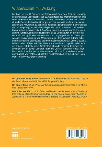 Der Band vereint 22 Beiträge von Kollegen und Freunden, Schülern und Weggefährten Klaus Schönbachs. Den 60. Geburtstag des international hoch angesehenen Kommunikationswissenschaftlers nehmen die Autoren zum Anlass, aktuelle Fragen der Medienwirkungs- und der Journalismusforschung aufzugreifen. Die Antworten, zu denen sie gelangen, dokumentieren in ihrer Vielfalt die Leistungsfähigkeit, Zeitnähe und gesellschaftliche Relevanz des Faches Kommunikationswissenschaft. Das Spektrum reicht von den Anforderungen an eine künftige Journalistenausbildung bis zu Datenspuren im Internet als Herausforderung für den Journalismus, vom Umgang der Medien mit Ungewissheit bis zur Messung von Meinungsmacht. Dass sich die Autoren dabei immer wieder auf die Impulse, die theoretische Pionierarbeit und die gedankliche Exzellenz Schönbachs beziehen, kommt nicht von ungefähr: Wie kaum ein anderer hat der heute in Amsterdam lehrende Forscher dem Fach vor allem auf diesen beiden Gebieten Profil und Qualität verliehen. Klaus Schönbach hat in über drei Jahrzehnten wissenschaftliche Erkenntnisse ebenso unermüdlich wie rhetorisch brillant in die Gesellschaft vermittelt. Sein Name steht für Wissenschaft mit Wirkung.
