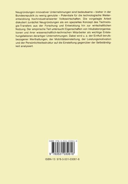Ausrichtung und Begründung der Untersuchung.- 1. Grundprobleme.- 1.1 Die Phasen des Innovationsprozesses.- 1.2 Medien des Technologietransfers und ihre Stellung zwischen Inventor bzw. Innovator.- 2. Unternehmungsgründung und Innovationsprozess.- 2.1 Die Beziehung zwischen TBUs und Spin-off-Gründungen.- 2.2 Definition von Spin-offs und ihre Typologie.- 2.3 Betrachtung von TBUs und Spin-offs aus unterschiedlicher Sicht.- 3. Einflussfaktoren für Die Entstehung von Spin-off-Gründungen.- 3.1 Potentielle Gründer von Spin-off-Unternehmungen.- 3.2 Potentielle Inkubatororganisationen.- 3.3 Untersuchungsvariablen-Komplexe.- 3.4 Bezugsrahmen der Untersuchung.- 4. Untersuchungsdesign.- 4.1 Ablauf der Untersuchung im Überblick.- 4.2 Auswahl der Befragtengruppen.- 4.3 Methodische Konzeptionierung der Erhebungsinstrumente.- 4.4 Organisatorische Vorbereitung der Erhebungsarbeiten.- 4.5 Organisation der Erhebungsarbeiten in der Haupterhebung.- 4.6 Besondere Schwierigkeiten bei den Erhebungsarbeiten.- 4.7 Auswertungsmethodik.- 5. Untersuchungsergebnisse.- 5.1 Kontaktierte und realisierte Stichprobengrößen in der Vor- und Hauptbefragung.- 5.2 Ergebnisse auf Mitarbeiterebene.- 5.3 Variablen der Inkubatororganisation.- 5.4 Zwei- und mehrdimensionale Zusammenhänge zwischen persönlicher Einstellung zur Selbständigkeit und ausgesuchten Auswertungsvariablen.- 6. Ausblick der Untersuchung.- 6.1 Kritische Reflexion des gewählten Ansatzes und Vorschläge für zukünftige Untersuchungen.- 6.2 Hinweise für die Förderung innovativer Unternehmungen.- 7. Kurzfassung der Untersuchung.- Allgemeine berufsbezogene Wertorientierung.- Leistungsmotivation.- Mobilität.- Bezugsgruppen.- Weitere Bedingungen für die Selbständigkeit.- Persönlichkeitseigenschaften und allgemeine Intelligenz.-Einstellung gegenüber der Selbständigkeit.- Die persönliche Einstellung gegenüber der Selbständigkeit in Beziehung zu anderen Größen.- Ausblick der Untersuchung.- Hinweise für die Förderung innovativer Unternehmungen.- Anmerkungen.- Verzeichnis der Abbildungen.- Verzeichnis der Tabellen.- Verzeichnis des Anhangs.