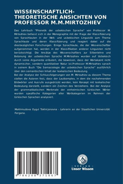 Das Lehrbuch "Phonetik der usbekischen Sprache" von Professor M. Mirtozhiev befasst sich in der Monographie mit der Frage der Klassifizierung von Sprachlauten in der Welt- und usbekischen Linguistik zum Thema Sprachlaute und deren Klassifizierung und reagiert dabei auf die diesbezüglichen Forschungen. Einige Sprachlaute, die der Wissenschaftler aufgenommen hat, werden in der Klassifikation anderer Linguisten nicht berücksichtigt. Die Ansätze des Wissenschaftlers zur Silbenlehre und Betonung der usbekischen Sprache M.Mirtozhiev wurden auf Usbekisch durch seine Argumente erläutert, die beweisen, dass der Wortakzent nicht dynamischer, sondern quantitativer Natur ist.Professor M.Mirtozhiev sprach in seinem Buch ''Die Semasiologie der usbekischen Sprache'' ausführlich über den semantischen Inhalt der lexikalischen Bedeutung.Bei der Analyse der Schlussfolgerungen von M. Mirtozhiev zu diesem Thema stellen die Autoren fest, dass der Lautkomplex, in dem die nachahmenden Bildwörter und Ausrufe ausgedrückt werden, kein Konzept mit lexikalischer Bedeutung darstellt, sondern ein Zeichen des Verstehens. Bei der Analyse der grammatikalischen Merkmale der einheimischen türkischen Wörter wurden spezifische Kategorien aller Wortkategorien im Rahmen der türkischen Sprachen analysiert.