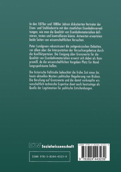 In den 1870er und 1880er Jahren diskutierten Vertreter der Eisen- und Stahlindustrie mit den staatlichen Eisenbahnverwaltungen, wie man die Qualität von Eisenbahnmaterialien definieren, testen und kontrollieren könne. Antworten erwarteten beide Seiten von wissenschaftlichen Versuchen. Peter Lundgreen rekonstruiert die zeitgenössischen Debatten, vor allem aber die Interpretation der Versuchsergebnisse durch die Konfliktparteien. Die Einigung über Grenzwerte für die Qualität von Eisenbahnmaterialien erweist sich dabei als Kompromiß, da die wissenschaftlichen Vorgaben Platz für Handlungsspielräume ließen. Die historische Fallstudie beleuchtet die frühe Zeit eines bis heute aktuellen Musters politischer Regulierung von Risiken. Die Berufung auf Grenzwerte und die damit verknüpfte wissenschaftlich-technische Expertise dient auch heutzutage als Quelle der Legitimation für politische Entscheidungen.
