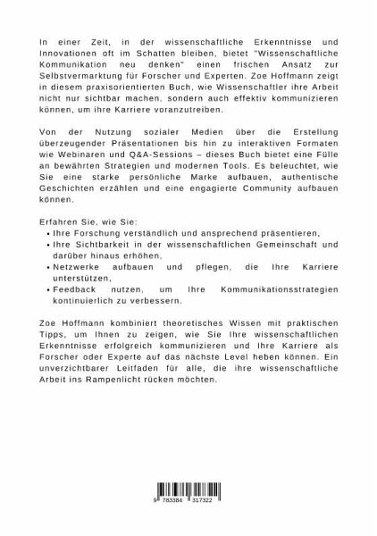 In einer Zeit, in der wissenschaftliche Erkenntnisse und Innovationen oft im Schatten bleiben, bietet "Wissenschaftliche Kommunikation neu denken" einen frischen Ansatz zur Selbstvermarktung für Forscher und Experten. Zoe Hoffmann zeigt in diesem praxisorientierten Buch, wie Wissenschaftler ihre Arbeit nicht nur sichtbar machen, sondern auch effektiv kommunizieren können, um ihre Karriere voranzutreiben.Von der Nutzung sozialer Medien über die Erstellung überzeugender Präsentationen bis hin zu interaktiven Formaten wie Webinaren und Q&A-Sessions - dieses Buch bietet eine Fülle an bewährten Strategien und modernen Tools. Es beleuchtet, wie Sie eine starke persönliche Marke aufbauen, authentische Geschichten erzählen und eine engagierte Community aufbauen können.Erfahren Sie, wie Sie:Ihre Forschung verständlich und ansprechend präsentieren,Ihre Sichtbarkeit in der wissenschaftlichen Gemeinschaft und darüber hinaus erhöhen,Netzwerke aufbauen und pflegen, die Ihre Karriere unterstützen,Feedback nutzen, um Ihre Kommunikationsstrategien kontinuierlich zu verbessern.Zoe Hoffmann kombiniert theoretisches Wissen mit praktischen Tipps, um Ihnen zu zeigen, wie Sie Ihre wissenschaftlichen Erkenntnisse erfolgreich kommunizieren und Ihre Karriere als Forscher oder Experte auf das nächste Level heben können. Ein unverzichtbarer Leitfaden für alle, die ihre wissenschaftliche Arbeit ins Rampenlicht rücken möchten.