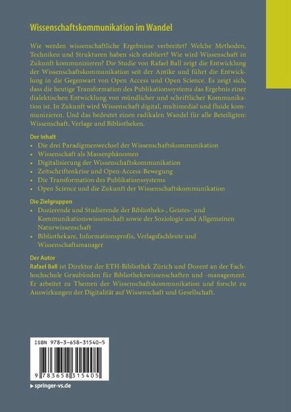 Wie werden wissenschaftliche Ergebnisse verbreitet? Welche Methoden, Techniken und Strukturen haben sich etabliert? Wie wird Wissenschaft in Zukunft kommunizieren? Die Studie von Rafael Ball zeigt die Entwicklung der Wissenschaftskommunikation seit der Antike und führt die Entwicklung in die Gegenwart von Open Access und Open Science. Es zeigt sich, dass die heutige Transformation des Publikationssystems das Ergebnis einer dialektischen Entwicklung von mündlicher und schriftlicher Kommunikation ist. In Zukunft wird Wissenschaft digital, multimedial und fluide kommunizieren. Und das bedeutet einen radikalen Wandel für alle Beteiligten: Wissenschaft, Verlage und Bibliotheken.