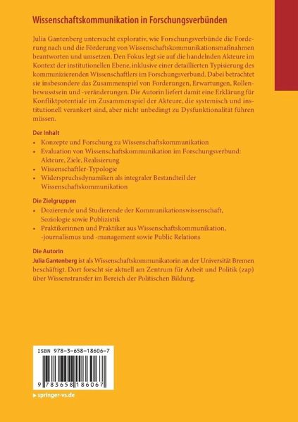 Julia Gantenberg untersucht explorativ, wie Forschungsverbünde die Forderung nach und die Förderung von Wissenschaftskommunikationsmaßnahmen beantworten und umsetzen. Den Fokus legt sie auf die handelnden Akteure im Kontext der institutionellen Ebene, inklusive einer detaillierten Typisierung des kommunizierenden Wissenschaftlers im Forschungsverbund. Dabei betrachtet sie insbesondere das Zusammenspiel von Forderungen, Erwartungen, Rollenbewusstsein und -veränderungen. Die Autorin liefert damit eine Erklärung für Konfliktpotentiale im Zusammenspiel der Akteure, die systemisch und institutionell verankert sind, aber nicht unbedingt zu Dysfunktionalität führen müssen.