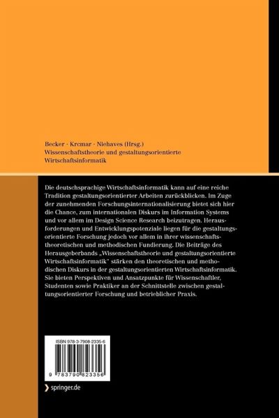 Forschungsmethodik einer Integrationsdisziplin - Eine Fortführung und Ergänzung zu Lutz Heinrichs "Beitrag zur Geschichte der Wirtschaftsinformatik" aus gestaltungsorientierter Perspektive.- From Communicative Action Theory to Socio-Technical Artifacts: Presentation of Three System Prototypes.- Business Ethnography - Aktionsforschung als Beitrag zu einer reflexiven Technikgestaltung.- Systematisierung von Evaluationsmethoden in der gestaltungsorientierten Wirtschaftsinformatik.- Theories of Language in IS Research - A Review.- The Ideology of Design: A Critical Appreciation of the Design Science Discourse in Information Systems and Wirtschaftsinformatik.- Konstruktivismus und Wirtschaftsinformatik - Begriffsver(w)irrungen.- Die Konstruktion möglicher Welten als Chance und Herausforderung der Wirtschaftsinformatik.- Explicating Design Theories with Conceptual Models: Towards a Theoretical Role of Reference Models.- Entwicklung eines Bezugsrahmens für Konstruktionsforschung und Artefaktkonstruktion in der gestaltungsorientierten Wirtschaftsinformatik.- Theorien sozialer Praktiken zur Fundierung der Wirtschaftsinformatik.- Wirtschaftsinformatik und Wissenschaftstheorie - Zwischen Konformität und organisiertem Wildwuchs.
