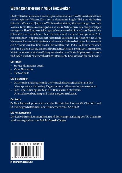 Photovoltaikunternehmen unterliegen internationalem Wettbewerbsdruck um technologisches Wissen. Die Service-dominante Logik (SDL) im Marketing betrachtet Wissen als Quelle von Wettbewerbsvorteilen; Akteure erlangen demnach Wissen durch Ressourcenintegration in Value Netzwerken. Allerdings erfolgen strategische Handlungsempfehlungen in Netzwerken häufig auf Grundlage einzeln betrachteter Netzwerkebenen. Marc Banaszak weist vor dem Hintergrund der SDL mit quantitativ-empirischen Befunden nach, dass sämtliche Akteure eines Value Netzwerks Ressourcen integrieren und zu neuem Wissen beitragen. Er untersucht ein Netzwerk aus dem Bereich der Photovoltaik mit 115 Herstellerunternehmen und 318 Partnern aus Industrie und Forschung. Mit seinen originären Ergebnissen leistet er einen wesentlichen Beitrag zur Analyse von Wertschöpfungsnetzwerken und liefert auch für Netzwerkakteure interessante Erkenntnisse für die Praxis.
