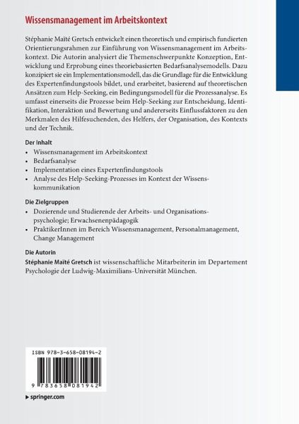 Stéphanie Maïté Gretsch entwickelt einen theoretisch und empirisch fundierten Orientierungsrahmen zur Einführung von Wissensmanagement im Arbeitskontext. Die Autorin analysiert die Themenschwerpunkte Konzeption, Entwicklung und Erprobung eines theoriebasierten Bedarfsanalysemodells. Dazu konzipiert sie ein Implementationsmodell, das die Grundlage für die Entwicklung des Expertenfindungstools bildet, und erarbeitet, basierend auf theoretischen Ansätzen zum Help-Seeking, ein Bedingungsmodell für die Prozessanalyse. Es umfasst einerseits die Prozesse beim Help-Seeking zur Entscheidung, Identifikation, Interaktion und Bewertung und andererseits Einflussfaktoren zu den Merkmalen des Hilfesuchenden, des Helfers, der Organisation, des Kontexts und der Technik.