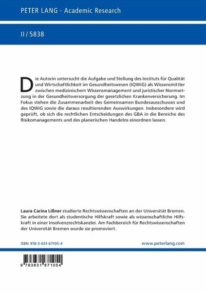 Die Autorin untersucht die Aufgabe und Stellung des Instituts für Qualität und Wirtschaftlichkeit im Gesundheitswesen (IQWiG) als Wissensmittler zwischen medizinischem Wissensmanagement und juristischer Normsetzung in der Gesundheitsversorgung der gesetzlichen Krankenversicherung. Im Fokus stehen die Zusammenarbeit des Gemeinsamen Bundesausschusses und des IQWiG sowie die daraus resultierenden Auswirkungen. Insbesondere wird geprüft, ob sich die rechtlichen Entscheidungen des GBA in die Bereiche des Risikomanagements und des planerischen Handelns einordnen lassen.