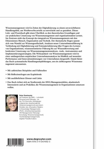 Wissensmanagement wird in Zeiten der Digitalisierung zu einem unverzichtbaren Handlungsfeld, um Wettbewerbsvorteile zu entwickeln und zu gestalten. Dieses Lehr- und Praxisbuch gibt einen Überblick zu den theoretischen Grundlagen und zur praktischen Umsetzung von Wissensmanagement und organisationalem Lernen. Im Zentrum steht das Konzept des integrativen Wissensmanagements mit den Dimensionen Mensch, Organisation und Technik. Der thematische Bogen spannt sich vom Wandel zur Wissensgesellschaft, Ansätzen neuer Unternehmensführung in Verbindung mit Digitalisierung und Entmaterialisierung über Fragen des Lernens von Organisationen, wissensorientierter Führung bis zur Wissensbewertung und konkreten Umsetzung von Wissensmanagementansätzen, -tools, -instrumenten und Implementierungsstrategien. Die Wirksamkeit von Wissensmanagement wird in einer umfangreichen empirischen Unternehmensanalyse im Hinblick auf monetäre Performance und Innovationsleistungen von Unternehmen dargestellt. Damit bietet das Buch systematische Handlungsempfehlungen, um ein zielbezogenes Wissensmanagement umzusetzen.