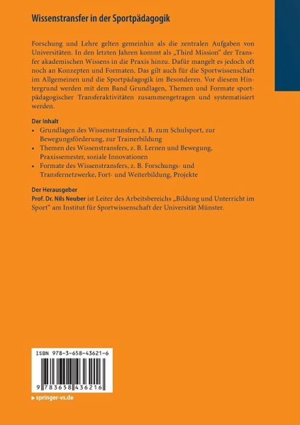 Forschung und Lehre gelten gemeinhin als die zentralen Aufgaben von Universitäten. In den letzten Jahren kommt als "Third Mission" der Transfer akademischen Wissens in die Praxis hinzu. Dafür mangelt es jedoch oft noch an Konzepten und Formaten. Das gilt auch für die Sportwissenschaft im Allgemeinen und die Sportpädagogik im Besonderen. Vor diesem Hintergrund werden mit dem Band Grundlagen, Themen und Formate sportpädagogischer Transferaktivitäten zusammengetragen und systematisiert.