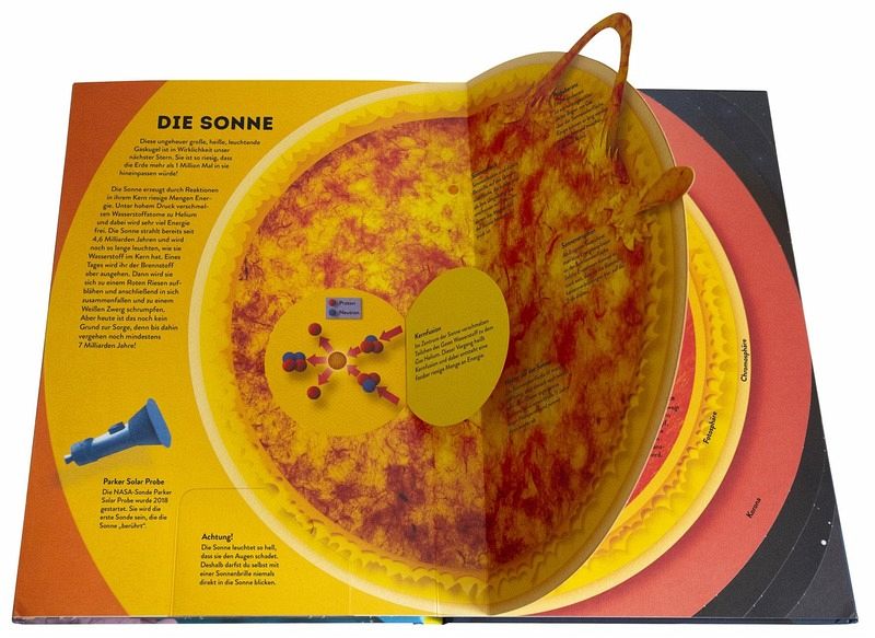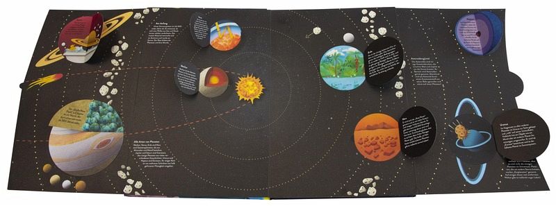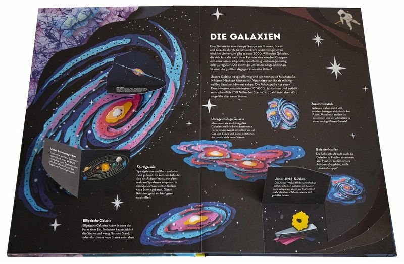 - Sterne, Planeten und Kometen: Auf über 30 großen und kleinen Klappen sorgen die kreativen Scherenschnitte von Papierkünstlerin Gail Armstrong für ein haptisches Erlebnis.