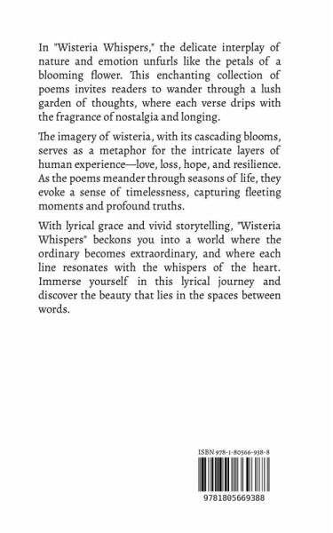 In "Wisteria Whispers," the delicate interplay of nature and emotion unfurls like the petals of a blooming flower. This enchanting collection of poems invites readers to wander through a lush garden of thoughts, where each verse drips with the fragrance of nostalgia and longing. The imagery of wisteria, with its cascading blooms, serves as a metaphor for the intricate layers of human experience-love, loss, hope, and resilience. As the poems meander through seasons of life, they evoke a sense of timelessness, capturing fleeting moments and profound truths. With lyrical grace and vivid storytelling, "Wisteria Whispers" beckons you into a world where the ordinary becomes extraordinary, and where each line resonates with the whispers of the heart. Immerse yourself in this lyrical journey and discover the beauty that lies in the spaces between words.