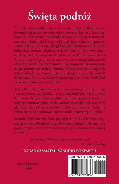 Z przyjemno¿ci¿ oddajemy w r¿ce czytelników t¿ d¿ugo wyczekiwan¿ ksi¿¿k¿ autorstwa jednej z pierwszych kobiet z Zachodu, które odkry¿y Amm¿, opowiadaj¿c¿ o jej duchowych do¿wiadczeniach u boku tej O¿wieconej Duszy. Jest to intymny portret, zarówno humorystyczny, jak i g¿¿boki, malowany oczami kobiety, która s¿u¿y Ammie od pierwszych dni aszramu po chwil¿ obecn¿. Czytelnik uzyskuje tu wgl¿d w niezwykle klarowne s¿owa Ammy oraz Jej inspiruj¿ce zachowania w niespodziewanych okoliczno¿ciach. ¿ycie uczennicy ulega stopniowej transformacji dzi¿ki promiennej mi¿o¿ci Ammy. Mi¿o¿¿ zawarta w m¿drych wskazówkach oraz wspó¿czucie przejawiaj¿ce si¿ w codziennych dziäaniach Ammy z pewno¿ci¿ pozostawi¿ po sobie trwäy ¿lad tak¿e w ¿wiadomo¿ci czytelnika. Mata Amritanandamayi - zwana przez miliony ludzi na cäym ¿wiecie Amm¿ lub Matk¿ - jest znan¿ indyjsk¿ ¿wi¿t¿, której dziäania charytatywne o globalnym zasi¿gu przynios¿y Jej mi¿dzynarodowe uznanie. Najbardziej zas¿yn¿¿a jednak ze swej g¿¿bokiej duchowej szczodro¿ci, udzielaj¿c tysi¿com ludzi na cäym ¿wiecie b¿ogos¿awie¿stw w formie matczynego u¿cisku. Swamini Krishnamrita Prana przyby¿a do Indii z Australii, maj¿c niewiele ponad dwadzie¿cia lat. Powodem podró¿y by¿y duchowe poszukiwania, które wkrótce zawiod¿y j¿ w otwarte ramiona jej Matki. Published By The Disciples Of Mata Amritanandamayi Devi, Affectionately Known As Mother, Or Amma The Hugging Saint.