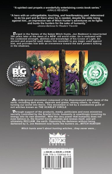 An underground movement composed of the dispossessed elder races of the Earth including dark elves, dwarves and goblins among others is slowly turning our world into theirs. This movement is led by a clandestine guild of evil witches known as The Scarlet Circle. Humanity unwittingly invests its energy into its own downfall through its support of products, media, politicians and ministries that The Scarlet Circle controls. The Scarlet Circle is using that energy to renew and ultimately reclaim the Earth, which humanity is destroying with power it doesn't even believe it possesses. Forged in the flames of the Salem witch hunts, Jon Redmont is resurrected three hundred years later in the present day at the dawn of The Scarlet Circle's new old world order. He is endowed with the combined strength, abilities and knowledge of his coven of light, a spell making him resistant to magic used against him, and an irreverence toward the dark powers that be which lurk in the shadows. Opposing the darkness without being darkened by it, Jon Redmont now hunts the hunters as...Witch Hunter! Collects the popular indie Witch Hunter comic issues 1-4 written by Vincent J Ferrante. Featuring art by Scott, Victor Dominicis, Jim Webb, Adauto Silva, Normand, Matt Westfall, Tony Doya, Mykelangelo, Michal Dutkiewicz, Uwe Jarling, Alex Williamson, Frank Brunner, Alzir Alves & Eddie Torres. Cover art by Scott, Victor Dominicis & Alzir Alves. Readers' Favorite Book Award Winner & NYC Big Book Award Distinguished Favorite.