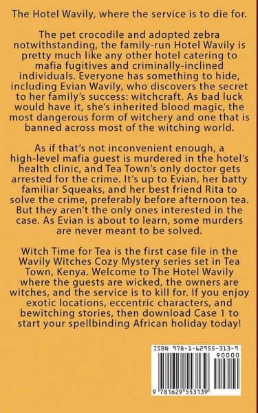 The Hotel Wavily, where the service is to die for. The pet crocodile and adopted zebra notwithstanding, the family-run Hotel Wavily is pretty much like any other hotel catering to mafia fugitives and criminally-inclined individuals. Everyone has something to hide, including Evian Wavily, who discovers the secret to her family's success: witchcraft. As bad luck would have it, she's inherited blood magic, the most dangerous form of witchery and one that is banned across most of the witching world. As if that's not inconvenient enough, a high-level mafia guest is murdered in the hotel's health clinic, and Tea Town's only doctor gets arrested for the crime. It's up to Evian, her batty familiar Squeaks, and her best friend Rita to solve the crime, preferably before afternoon tea. But they aren't the only ones interested in the case. As Evian is about to learn, some murders are never meant to be solved. Witch Time for Tea is the first case file in the Wavily Witches Cozy Mystery series set in Tea Town, Kenya. Welcome to The Hotel Wavily where the guests are wicked, the owners are witches, and the service is to kill for. If you enjoy exotic locations, eccentric characters, and bewitching stories, then download Case 1 to start your spellbinding African holiday today!